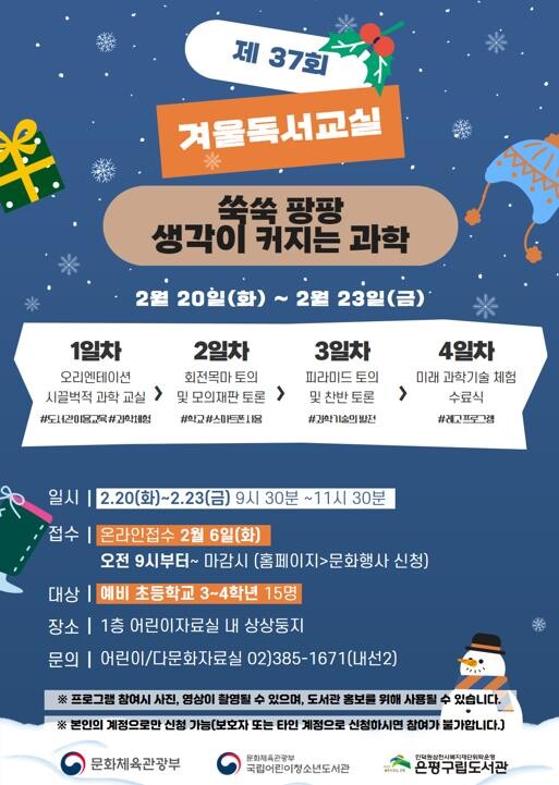 | ▲ 은평구립도서관, 겨울독서교실 ‘쑥쑥 팡팡 생각이 커지는 과학’ 포스터 (사진=은평청 제공) |