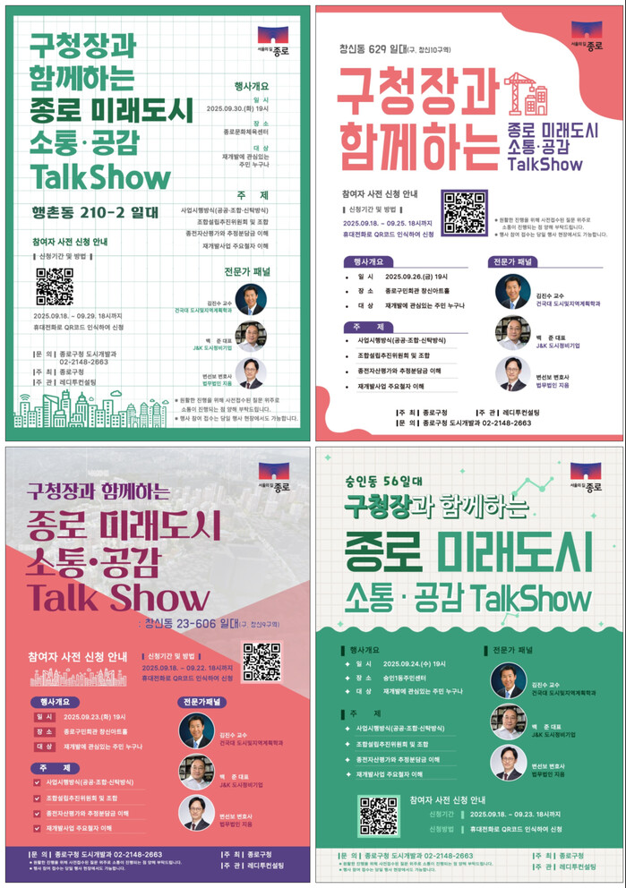 토크쇼 신청 및 사전 질문 제출은 포스터 내 정보무늬(QR코드)로 접속해 하면 된다. 당일 현장 참여도 가능하다. 구는 이번 토크쇼를 통해 정비사업 과정에서 예상되는 문제를 점검하고 주민과 직접 소통을 기반으로 해결책을 모색할 계획이다.