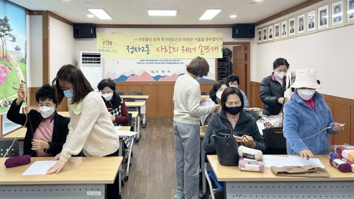 경기 수원시 장안구 정자2동은 16일 ‘따뜻한 겨울나기, 사랑의 손뜨개 강습’을 개최했으며, 오는 12월17일까지 손뜨개로 목도리를 150개 이상 제작해 홀몸노인 및 초등학생이 있는 위기가구 등에 크리스마스 선물로 전달할 예정이다. 사진은 이날 손뜨개 강습이 진행되고 있는 모습. (사진제공=수원시청)