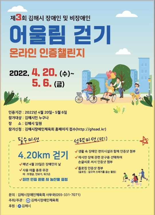 김해시장애인체육회는 제3회 김해시 장애인 및 비장애인 어울림 걷기 온라인 인증 챌린지를 개최한다고 19일 밝혔다.
