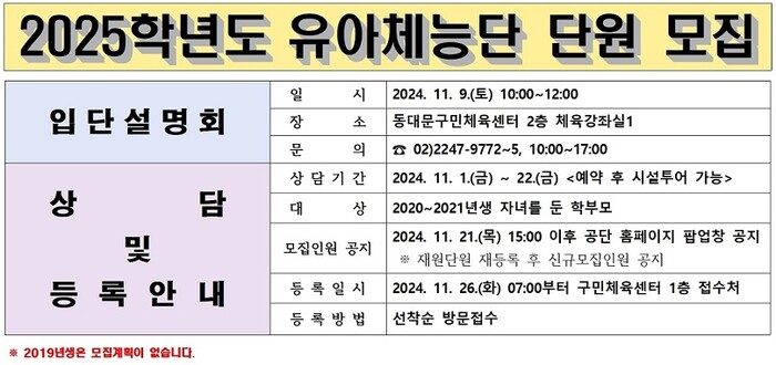 [시민일보 = 이대우 기자] 동대문구시설관리공단(이사장 인택환)에서 운영하는 동대문구민체육센터가 2025학년도 유아체능단 신입단원을 모집한다.