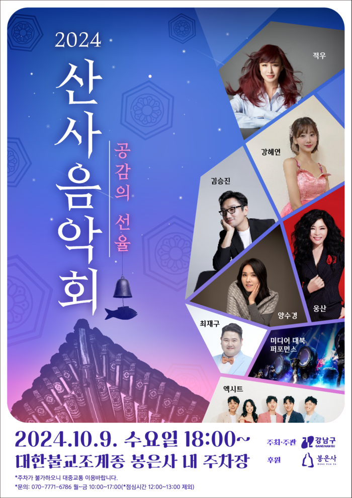 조성명 강남구청장은 “문화의 달 10월을 맞아 일상에서 잠시 벗어나 도심 속 산사음악회에서 아름다운 선율을 만끽하시길 바란다”며 “앞으로도 강남구의 전통과 문화를 살린 다양한 문화행사를 마련해 구민들에게 힐링의 기회를 제공하겠다”고 말했다.