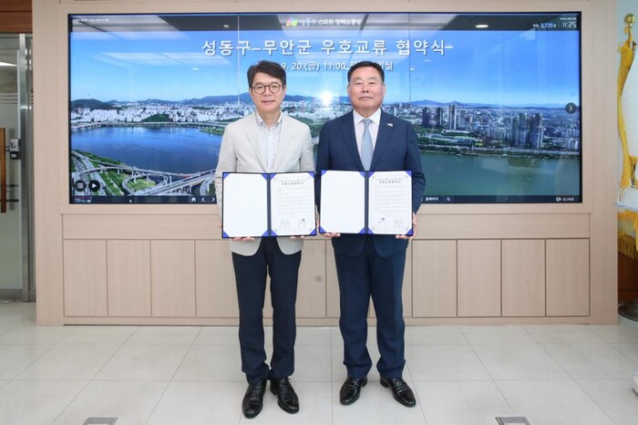 성동구는 최근 전남 무안군과 지역 공동 발전을 위한 우호 교류 협약식을 진행한 가운데 양 도시는 친선 강화 및 우수정책을 공유하고 각계 분야의 협력사업을 추진할 계획이다. 사진은 정원오 구청장(왼쪽)과 김산 군수의 기념 촬영 모습. (사진=성동구청 제공)