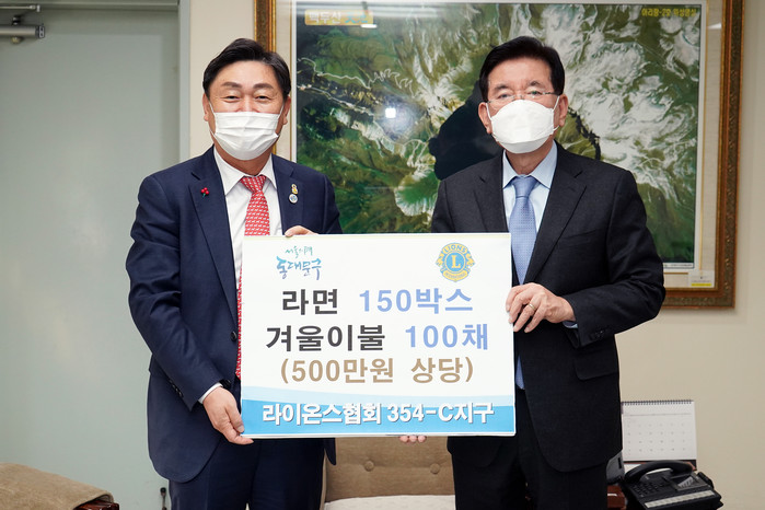 서울 동대문구는 20일 국제라이온스협회 354-C지구로부터 어려운 이웃을 위한 라면 150상자와 겨울이불 100채를 전달받았다. 사진은 전달식에서 유덕열 구청장(오른쪽)과 신현종 총재가 기념촬영을 하고 있는 모습. (사진제공=동대문구청)