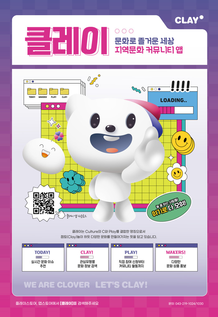 한편, 모바일 앱을 기반으로 한 [클레이]는 Culture, Communication, Cheongju의 C와 Play를 합성해 점토(Clay)놀이 하듯 문화를 마음껏 만들어가자는 뜻을 담아 개발한 문화도시 청주형 커뮤니티 앱이다. 지역문화 정보 검색, 프로그램 신청은 물론 지역 내 전시, 공연, 축제 등 문화 행사 내용을 직접 업로드하면서 쌍방향 커뮤니케이션이 가능하며 구글플레이스토어와 애플 앱스토어에서 다운로드 해 언제어디서든 즐길 수 있다.