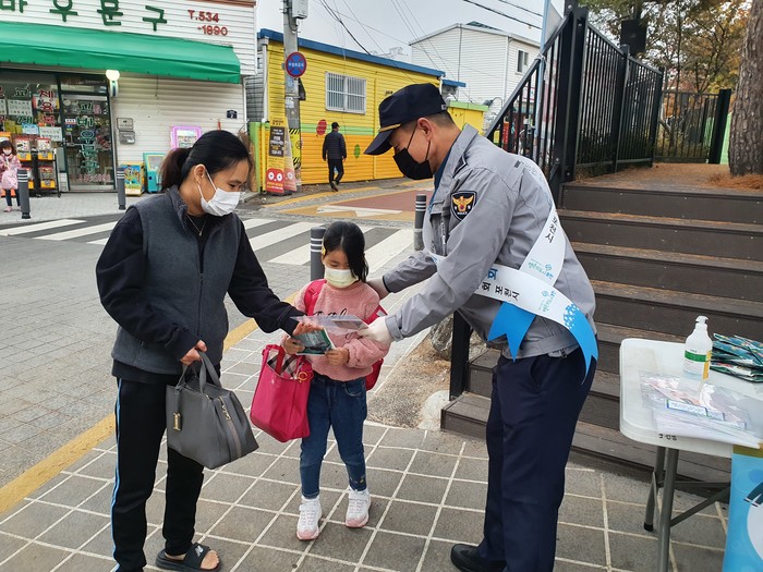 경기 포천시가 최근 아동학대예방의 날을 맞아 포천초등학교 정문에서 ‘아동학대예방 홍보캠페인’을 전개했다. 이날 캠페인에는 지역내 아동보호 유관기관 등이 참여했으며, 아이지킴콜 112 앱 설치 홍보 및 자녀징계권 폐지에 대한 홍보물을 배부했다. 사진은 이날 캠페인에서 어린이에게 홍보물을 나눠주고 있는 모습. (사진제공=포천시청)