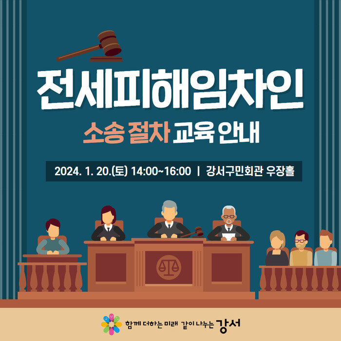 교육은 이날 오후 2시부터 강서구민회관 우장홀에서 2시간 동안 진행되며, 전세피해 소송 수행 절차에 도움이 필요한 사람이면 누구나 참여할 수 있다.