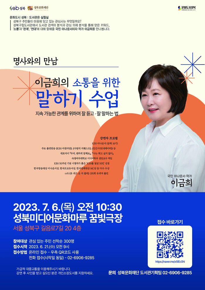 [시민일보 = 홍덕표 기자] 서울 성북구(구청장 이승로)가 오는 7월6일 오전 10시30분 성북미디어문화마루 꿈빛극장에서 방송인, 작가로 활발한 활동을 펼치고 있는 국민 아나운서 이금희와 만남의 자리를 마련한다.