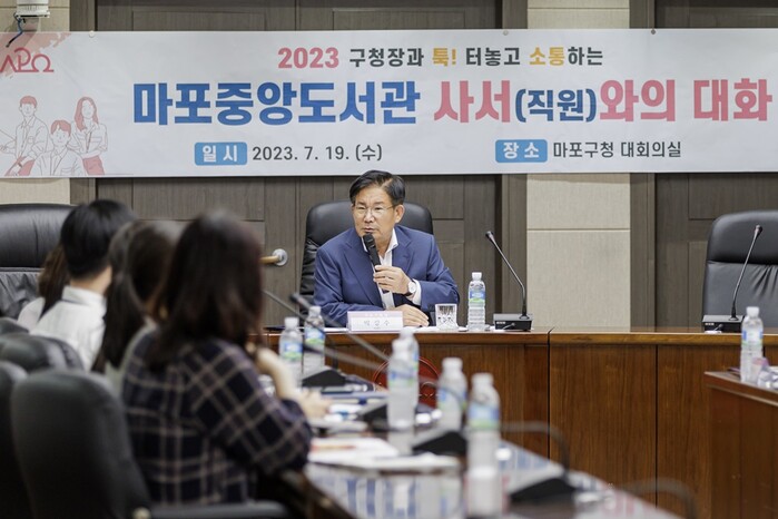 | ▲ 지난 7월 박강수 마포구청장이 마포중앙도서관 사서와 대화하는 시간을 가졌다. (사진=마포구청 제공) |