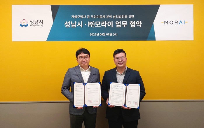 시는 이날 오전 10시 30분 ㈜모라이 사무실에서 주광호 성남시 아시아실리콘밸리담당관, 정지원 모라이 대표 등이 참석한 가운데 ‘자율주행차 등 무인 이동체 분야 산업발전을 위한 업무 협약’을 했다.