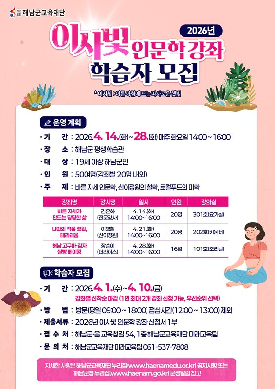 해남군교육재단은 ‘해남 이사빛 인문학 강좌’를 통해 군민의 인문학적 이해와 건강 증진, 지역 문화 활성화를 도모하고 앞으로도 평생교육 프로그램을 확대해 군민 학습권 보장과 삶의 질 향상에 기여할 계획이다.