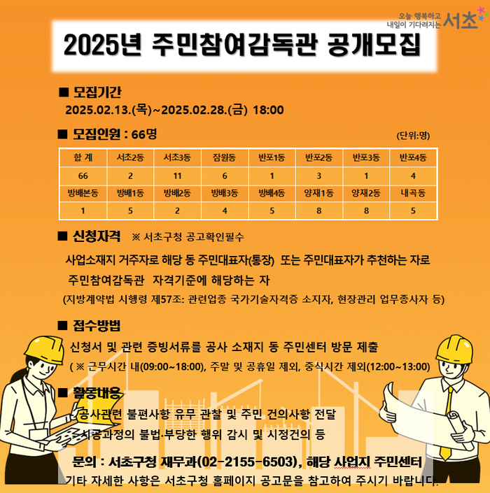 [시민일보 = 박소진 기자] 서초구(구청장 전성수)가 오는 28일까지 지역내 생활밀착형 공사에 ‘2025년 주민참여감독관’으로 참여할 주민 66명을 공개 모집한다고 밝혔다.