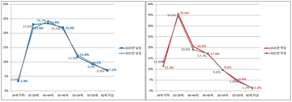 특히 35~39세 연령의 재혼 비율은 증가세를 보였다. 남성 23.0%, 여성 35.6%로 2년 사이(2021년 남 21.8%, 여 33.2%)로 각각 1.2%p, 2.4%p 상승했다.