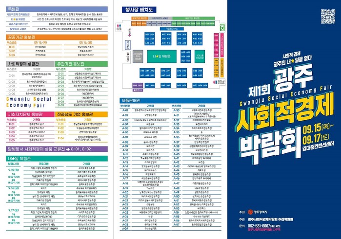 이번 박람회는 광주시가 주최하고 사회적경제 당사자조직, 중간지원조직, 유관기관, 학계 전문가, 시민사회단체 등이 참여하는 광주사회적경제박람회 추진위원회가 주관하는 민관 합동 행사로 88개 부스가 운영된다.