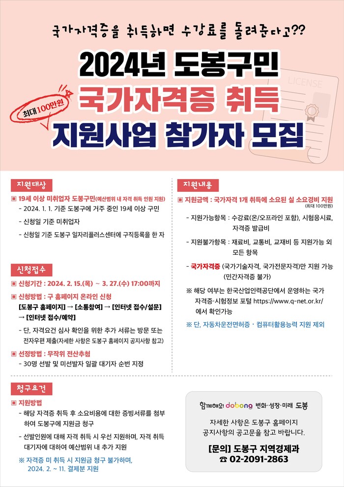 | ▲ 2024년 도봉구민 국가자격증 취득 지원사업 참가자 모집 홍보 포스터 (사진=도봉구청 제공) |