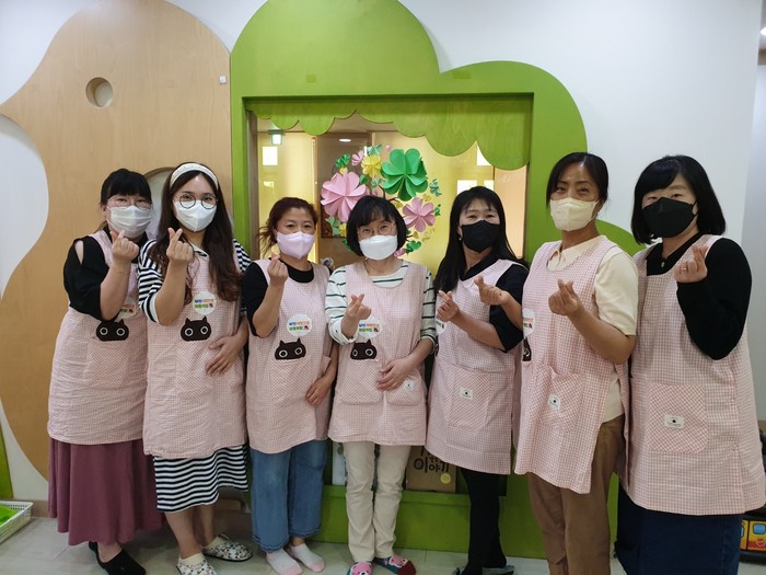 | ▲ 화성향남 9단지 부영 사랑으로 어린이집 보육교사들이 전달 받은 앞치마를 착용하고 기념촬영을 하는 모습. (사진제공=부영그룹) |
