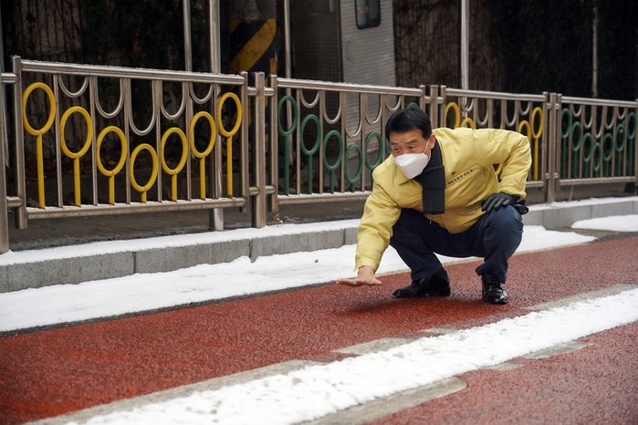 서울 성북구는 이달 현재 총 28곳에 연장 8.1km의 친환경 열선시스템을 설치 완료해 서울시 최다 친환경 스마트 열선시스템을 구축하고 겨울철 교통안전사고에 대비하고 있다. 사진은 지난 19일 이승로 구청장이 도로열선시스템이 설치된 정릉동 정수초등학교 앞 도로를 방문해 폭설 속 도로 상태를 둘러보고 있는 모습. (사진제공=성북구청)