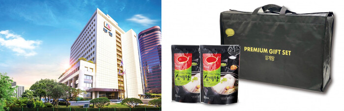 | ▲ 부영그룹 사옥 전경(좌), 현장근로자·관리소 및 그룹 내 전 임직원에게 지급한 삼계탕 선물세트(우). (사진=부영그룹 제공) |