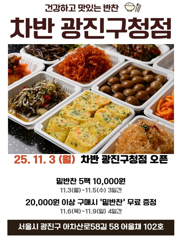 [시민일보 = 여영준 기자] 서울 광진구(구청장 김경호)가 자양동 어울채 행복주택(아차산로 58길, 58) 1층에 반찬가게 ‘차반 광진구청점’을 3일 개소했다.