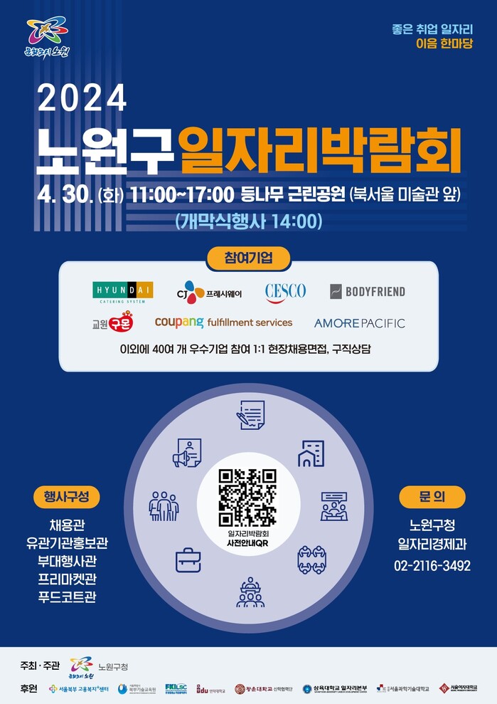 [시민일보 = 변은선 기자] 노원구(구청장 오승록)가 오는 30일 오전 11시~오후 5시 등나무근린공원에서 ‘2024 노원구 일자리 박람회’를 개최한다고 밝혔다.