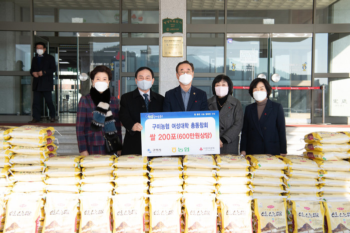 경북 구미시가 7일 구미농협 여성대학 총동창회로부터 불우이웃을 돕기 위한 성품으로 600만원 상당의 쌀(10kg) 200포를 기탁 받았다. 성품은 지역내 장애인주간보호시설 7곳 입소자들을 위해 사용될 예정이다. 사진은 기탁식에서 장세용 시장(가운데)과 관계자들이 기념촬영을 하는 모습. (사진제공=구미시청)