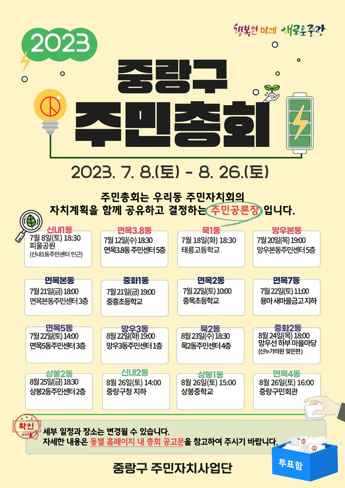 구에 따르면 주민총회는 오는 8일 신내1동을 시작으로 8월26일 면목4동까지 중랑구 16개 동 전역에서 진행될 예정이다.