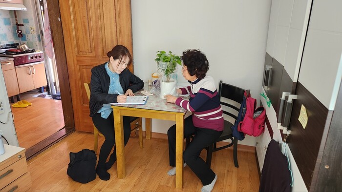 | ▲ 어르신 가정에 방문해 반려식물을 전달하고 원예치유사가 기초 교육을 실시하고 있다. (사진=중랑구청 제공) |