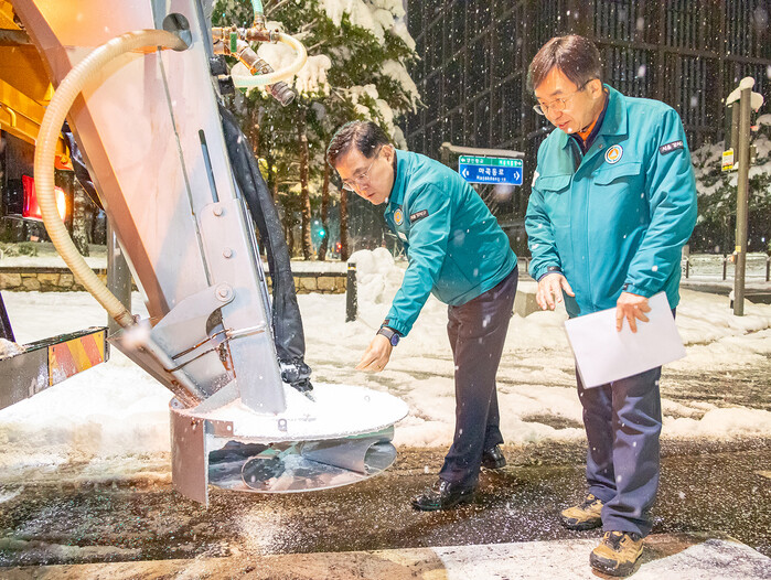 진교훈 서울 강서구청장이 28일 오전 6시30분 제설 현장점검에 나섰다. 현장을 찾은 진 구청장은 폭설로 인한 주민 피해상황, 시간대별 적설량, 염화칼슘, 소금과 같은 제설자재 비축 현황 등 제설상황을 보고받은 뒤 도로의 결빙상태를 살폈다. 사진은 진 구청장(왼쪽)이 마곡지구 일대 도로의 제설상황을 점검하는 모습. (사진=강서구청 제공)