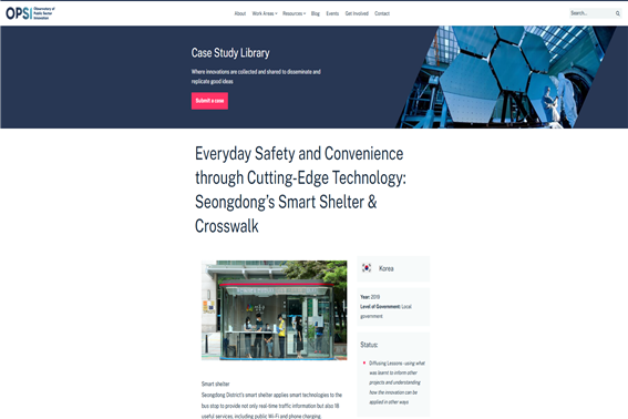 | ▲ '성동형 스마트쉼터·횡단보도'가 OECD 혁신 사례에 선정됐다. OECD 누리집(OPSI)에 소개된 모습 (사진=성동구청 제공) |