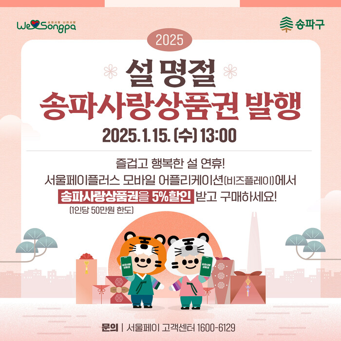 서강석 구청장은 “길어진 설명절, 장바구니 부담을 덜어줄 송파사랑상품권을 많이 구매하시어 풍성한 명절연휴 보내시길 바란다”라며, “새해에도 어려운 지역경제에 활력을 불어넣고, 가계에 실질적인 보탬을 드릴 수 있는 다양한 사업을 펼치겠다”라고 전했다.