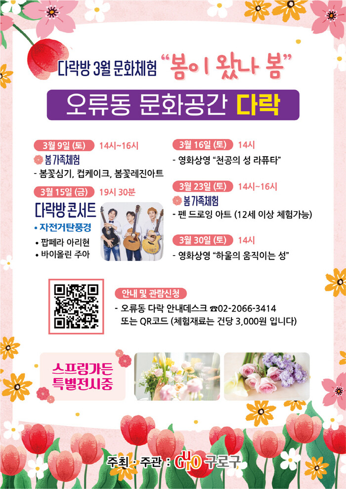 [시민일보 = 이대우 기자] 서울 구로구(문헌일 구청장)가 봄을 맞이하여 오는 3월 8일부터 30일까지 신도림·오류동 문화공간 다락에서 문화예술 프로그램을 운영한다.
