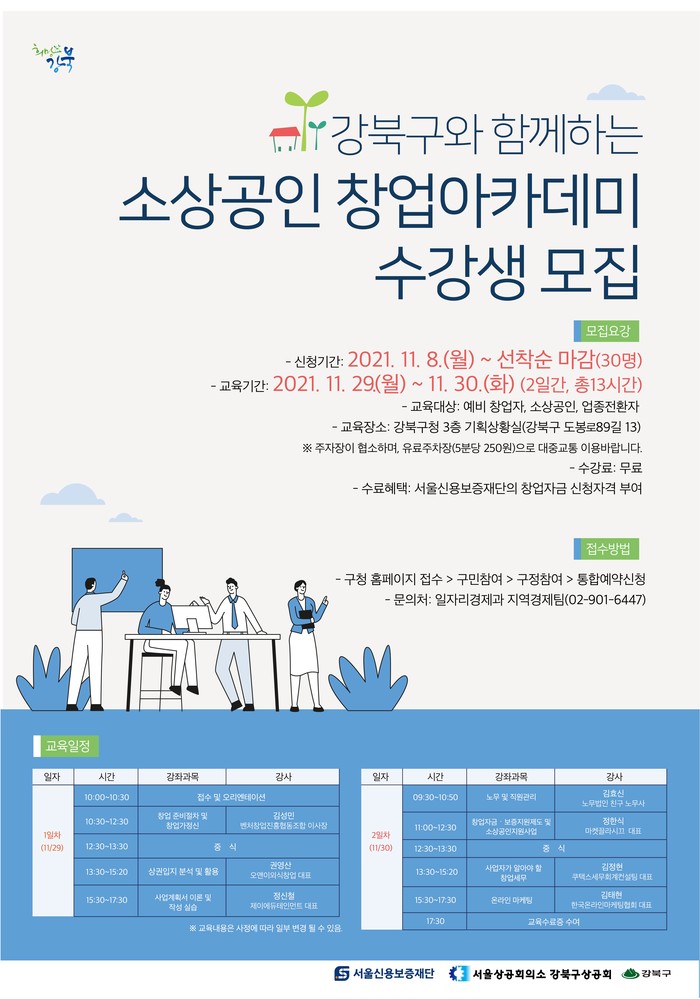 강북구상공회, 서울신용보증재단과 협업으로 진행되는 이번 교육은 예비창업자, 소상공인, 업종 전환자 등을 대상으로 창업교육과 정보제공을 통해 성공적인 창업을 할 수 있도록 지원한다.