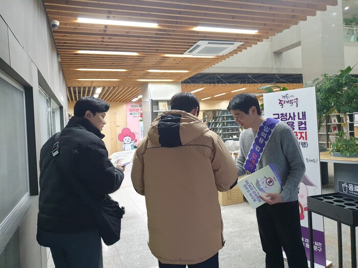 우선 구는 카페 이용이 많은 출근시간과 점심시간 동안 청사 출입구 쪽에서 직원들과 민원인들에게 일회용품 반입금지에 대한 안내문과 에코백을 전달했다.