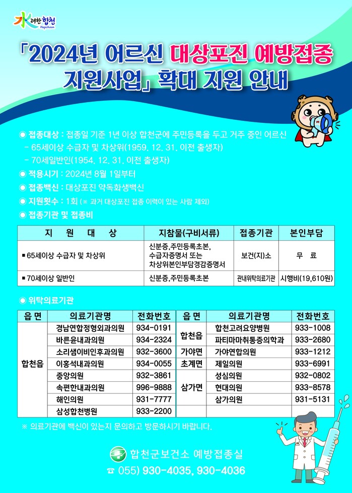 8월 기준 지원 대상은 접종일 기준으로 1년 이상 합천군에 주소를 두고 거주 중인 ▲수급자 및 차상위 건강보험전환자 기존대로 65세 이상(1959년 12월 31일 이전 출생자) ▲일반인은 기존 75세 이상에서 70세 이상(1954년 12월 31일 이전 출생자)으로 변경되었다.
