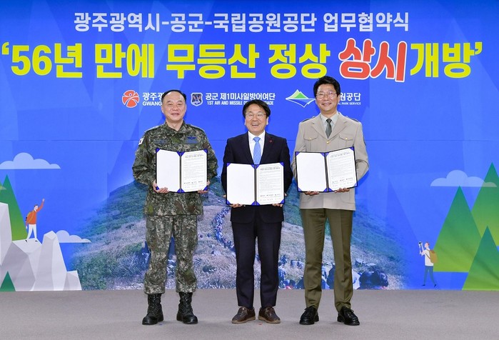 [광주=정찬남 기자] 광주광역시(시장 강기정)는 공군 제1미사일방어여단, 국립공원공단과 함께 20일 오전 11시 동구 무등산국립공원사무소에서 ‘무등산 정상 상시 개방을 위한 업무협약’을 체결했다.