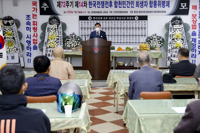 위령제는 한국전쟁 당시 좌.우 이념 대립 속에서 군인, 경찰, 적대세력 등에 의해 영문도 모른 채 끌려가 무고하게 희생당한 민간인들의 넋을 위로하기 위한 추모행사로, 김윤철 합천군수를 비롯해 조삼술 합천군의회의장, 성종태 합천군의회부의장이 참석했으며, 유족 30여 명이 자리를 함께했다. 또한, 김태호 국회의원은 조전을 통해 유족들에게 위로의 메시지를 전달했다.