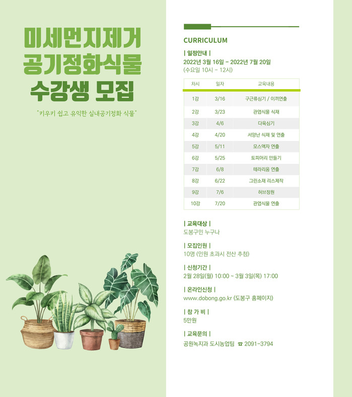 [시민일보 = 박준우 기자] 서울 도봉구(구청장 이동진)가 지역내 주민을 대상으로 ‘공기정화식물 교육’을 총 10회 운영한다.