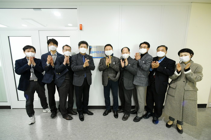 경기 구리시는 경기주택도시공사와 GH이전추진단 이전에 관한 협의를 마치고 최근 구리시 여성행복센터 4층으로 GH이전추진단 사무실을 이전했다. 사진은 지난 15일 안승남 시장(오른쪽 다섯 번째)이 현장을 방문해 기념촬영을 하는 모습. (사진제공=구리시청)
