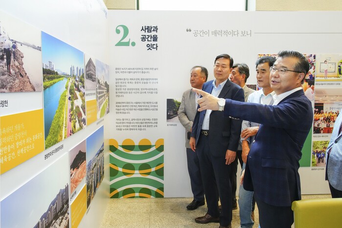 이어서 구청 로비에 마련된 사진전 ‘중랑을 잇다’를 주민들과 함께 관람했다. ‘중랑을 잇다’ 사진전은 중랑의 과거와 현재의 사진을 통해 구가 변화하고 발전한 모습을 조명하고, 미래 비전이 담긴 사진을 보며 지속가능한 발전의 의미를 공유하기 위해 마련됐다. 사진전은 오는 31일까지 열리며 누구나 무료로 관람 가능하다.