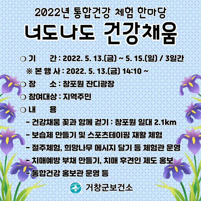 이번 행사는 코로나19 장기화에 따른 통합건강증진 대면 홍보·체험관 부족을 해소하기 위해 창포원에서 열리는 농업기술센터 아리미아 꽃 축제와 연계하여 건강증진 체험의 장을 마련한다.