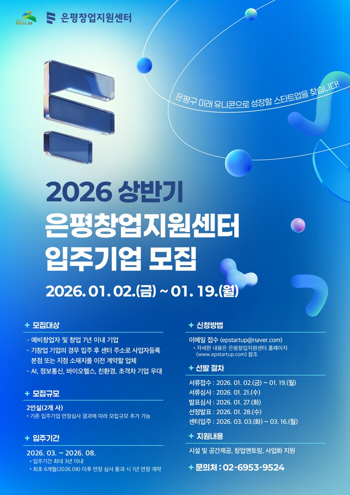 [시민일보 = 이대우 기자] 은평구(구청장 김미경)는 ‘2026년도 상반기 은평창업지원센터 입주기업’을 오는 19일까지 모집한다.