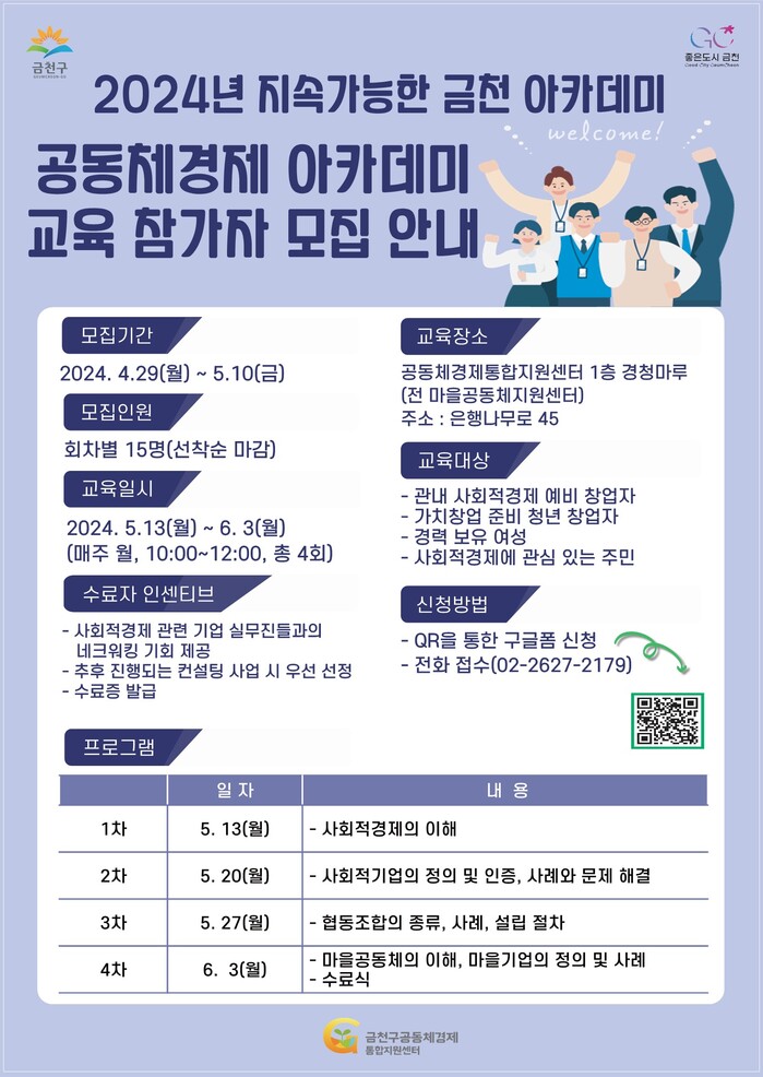 [시민일보 = 여영준 기자] 금천구(구청장 유성훈)는 지역사회 사회적경제를 활성화하기 위해 오는 13일부터 4주 동안 공동체경제통합지원센터에서 ‘지속가능한 금천 아카데미’를 운영한다고 밝혔다.