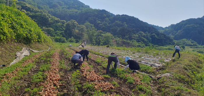 해당 농가는 봉산면 양지리에 위치한 규모 2,662㎡의 농가로, 수작업이 많이 필요하지만 일손이 부족하여 어려움을 겪고 있어, 직원들이 농가를 찾아가 양파 수확에 도움을 주었다.