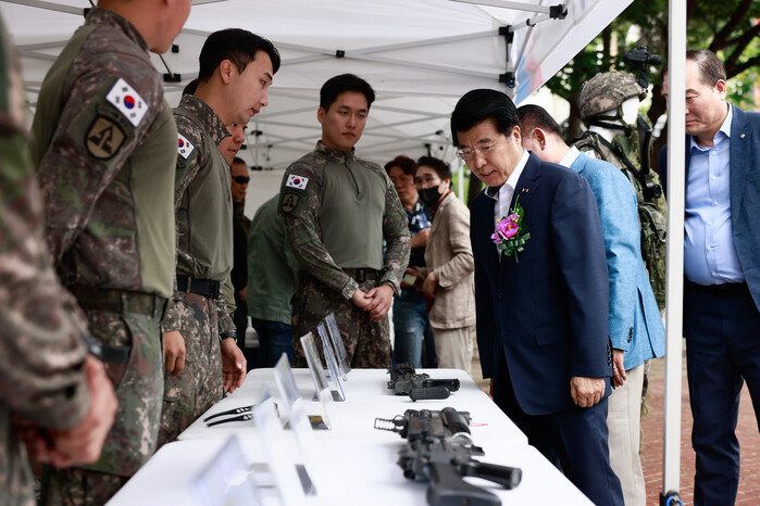 | ▲ ‘송파구 보훈가족 한마당’에 참석한 서강석 구청장이 전시된 총들을 살펴보고 있다. (사진=송파구청 제공) |
