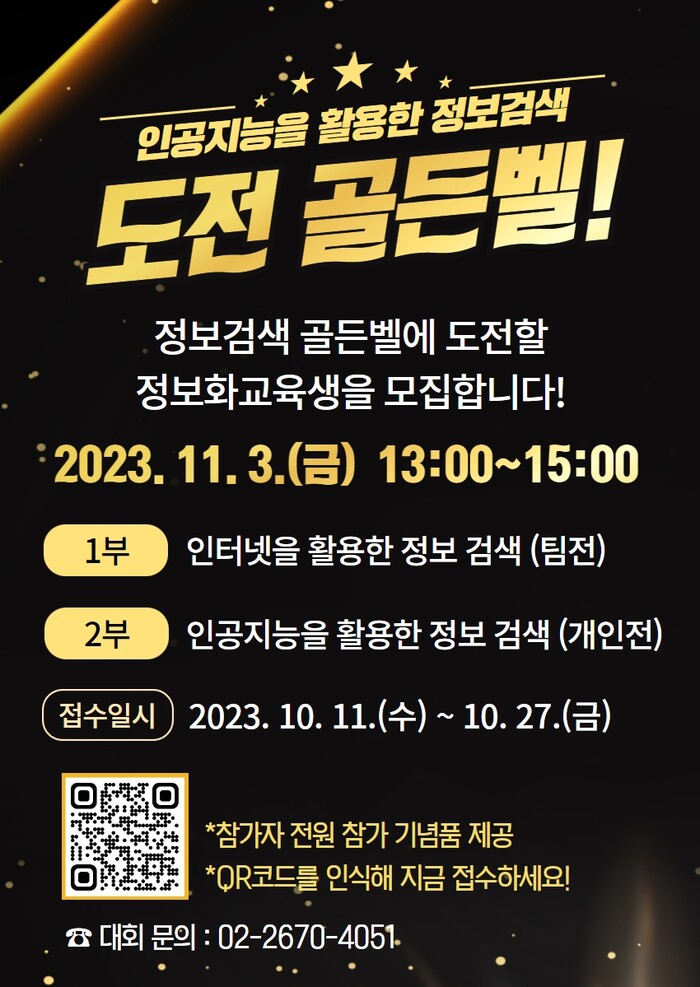 대회는 1부 ‘인터넷을 활용한 정보 검색’과 2부 ‘인공지능을 활용한 정보검색’으로 진행된다. 1부는 5명이 한 팀이 되어 준비된 노트북과 각자의 스마트폰으로 검색 포털과 인공지능 검색 서비스를 통해 문제를 검색하고, 정확한 답안을 가장 빨리 발표하면 된다. 팀은 랜덤으로 배정되며 10개 팀 중 상위 2개 팀이 2부에 진출한다.