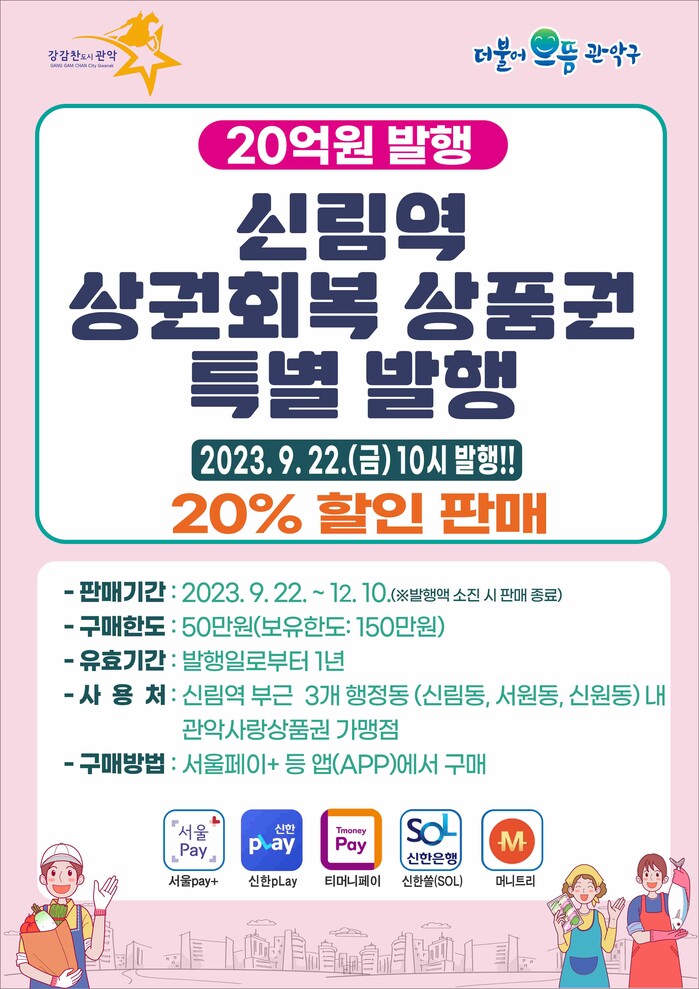 구는 오는 22일 오전 10시, 총 20억원 규모의 상품권을 20% 특별할인가로 발행한다. 사용처는 관악구 신림역 인근 3개 행정동(▲신림동 ▲서원동 ▲신원동) 내 관악사랑상품권 가맹점 1700여곳이다.