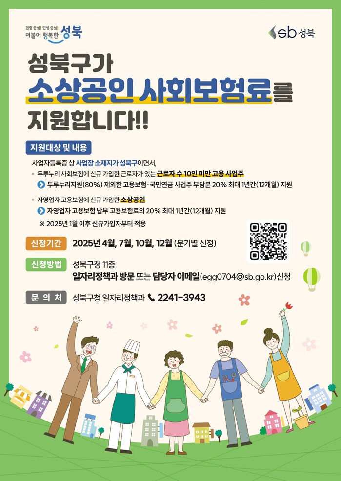 [시민일보 = 문민호 기자] 성북구(구청장 이승로)가 오는 4월11~18일 ‘2025년 성북구 소상공인 사회보험료 지원사업’ 1분기 신청을 받는다.
