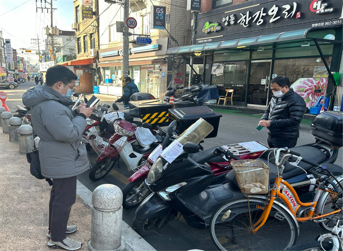 | ▲ 동대문구 직원들이 골목길 무단 방치된 이륜차에 경고장을 부착하고 있다. (사진=동대문구청 제공) |