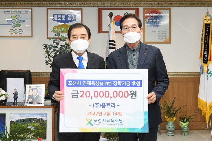 경기 (재)포천시교육재단은 지난 14일 (주)움트리로부터 장학금 2000만원을 기탁받았다. 사진은 기탁식에서 박윤국 이사장(왼쪽)과 관계자가 기념촬영을 하는 모습. (사진제공=포천시청)