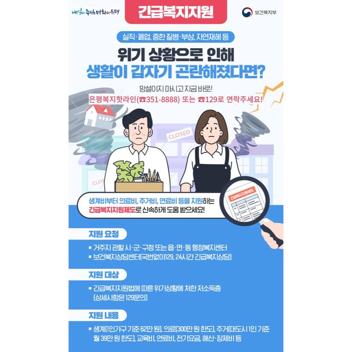 ‘긴급복지지원제도’는 실직, 폐업, 질병, 부상, 자연재해, 범죄 피해 등 갑작스러운 위기 상황 발생으로 생계유지가 곤란한 저소득층에게 긴급생계비와 의료비, 주거비, 교육비 등을 신속하게 지원해 주는 제도다. 국가형과 서울형, 은평형으로 지원되고 있으며 위기 상황에서 벗어나도록 도와준다.